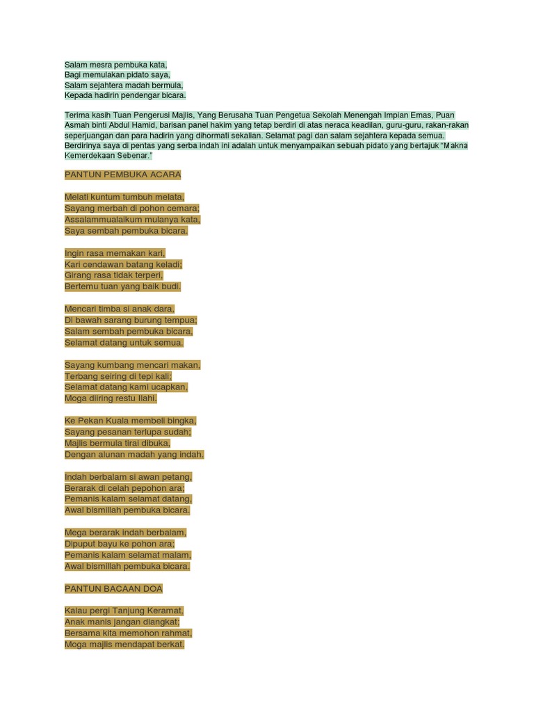 Berikut beberapa contoh pantun dalam berbagai acara. Pidato secara umum merupakan gagasan atau pesan yang disampaikan dalam bentuk rangkaian kalimat yang tersusun.