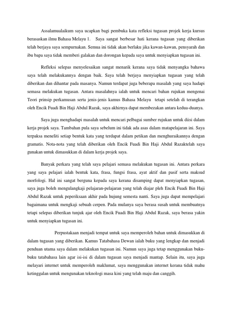 Assalamualaikum Saya Ucapkan Bagi Pembuka Kata Refleksi Tugasan Projek Kerja Kursus Berasaskan Ilmu Bahasa Melayu 1 Pdf